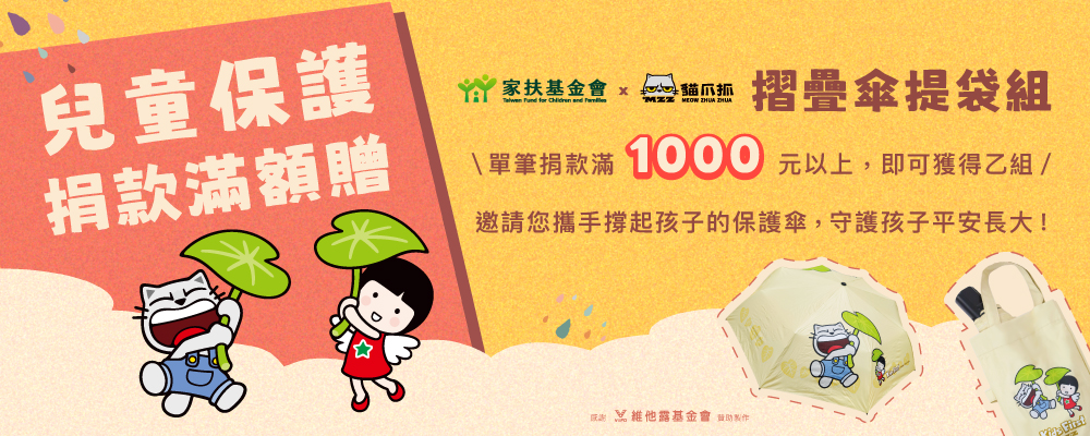 3/13起指定「兒童保護捐款滿額贈」單筆捐款滿1,000元即可獲得<家扶x貓爪抓>摺疊傘提袋組,邀請您攜手撐起孩子的保護傘,守護孩子平安長大!